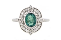 14K WHITE GOLD, EMERALD AND DIAMOND, HALO RING....