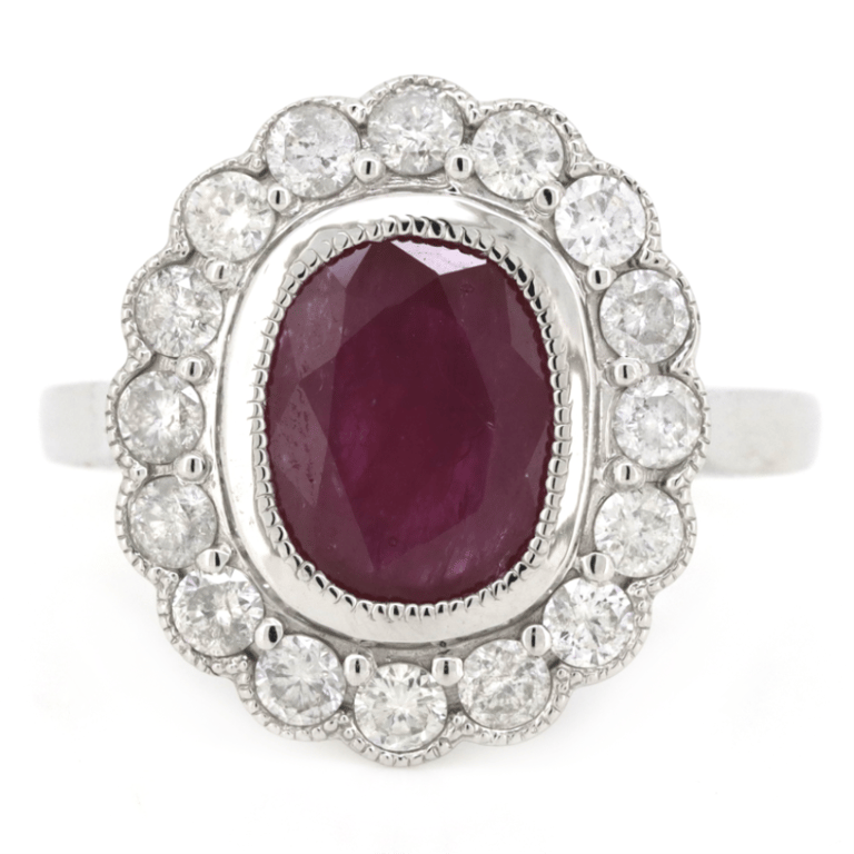The Centre Features, One Oval Cut, Medium Dark Purplish-Red, Ruby (2.76Ct Included), Bezel Set. Surrounding The Stone Are, 16 Round Brilliant Cut, Diamonds (0.89Ct Tdw, J-K Colour, Si2-I2 Clarity), Semi-Bezel/Bead Set. Ring Size P.