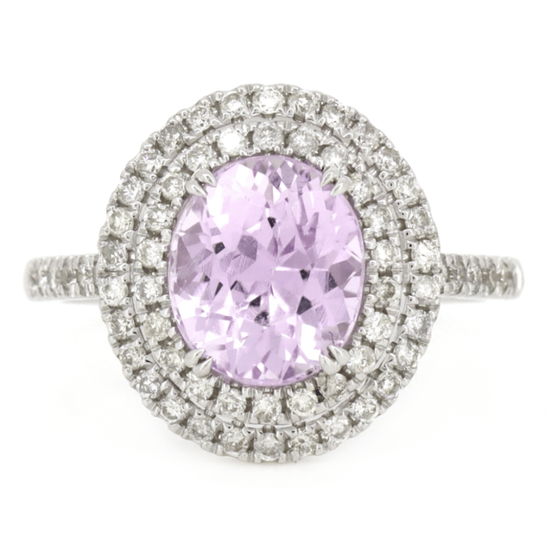 14K WHITE GOLD, KUNZITE AND DIAMOND, DOUBLE HALO RING. The Centre Features, One Oval Faceted Cut, Purplish-Pink, Kunzite (3.06Ct, Slightly Included), Double 4 Claw Set. Surrounding The Centre In A Double Halo And Decorating The Band Are, 62 Round Brilliant Cut, Diamonds (0.46Ct Tdw, J-L Colour, Si2-P2 Clarity), Claw Set. Ring Size M. Valuations Provided by an Independent Third-Party Professional Not Directly Associated With Lloyds Auctions at AUD $$9,270.00This valuation has been conducted by an independent third-party professional. The valuation amount is an assessment by the issuing valuer and does not reflect the auction value of the item. Any inquiries regarding the valuation should be directed to the issuing valuer (refer to contact details on the certificate), as Lloyds Auctions has no affiliation or influence over the valuation, the valuer, or the stated amount. Condition: Good - Refer Images 0645833+1361