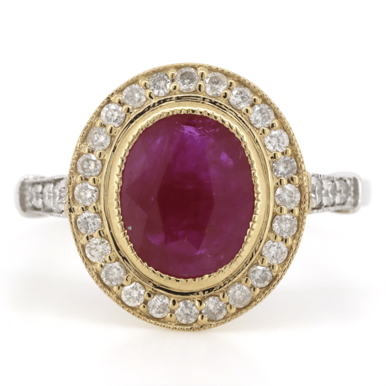 14K YELLOW/WHITE GOLD, RUBY AND DIAMOND, HALO RING. The Centre Features, One Oval Cut, Medium Purplish-Pink, Ruby (1.74Ct, Included), Bezel Set In Yellow Gold With Millegrain Detail. Surrounding The Centre In A Halo And Decorating The Band Are, 30 Round Brilliant Cut, Diamonds (0.37Ct Tdw, J-K Colour, Si2-I2 Clarity), Bead Set In Yellow/White Gold With Millegrain Detail. Ring Size O 1/2. Valuations Provided by an Independent Third-Party Professional Not Directly Associated With Lloyds Auctions at AUD $$9,490.00This valuation has been conducted by an independent third-party professional. The valuation amount is an assessment by the issuing valuer and does not reflect the auction value of the item. Any inquiries regarding the valuation should be directed to the issuing valuer (refer to contact details on the certificate), as Lloyds Auctions has no affiliation or influence over the valuation, the valuer, or the stated amount. Condition: Good - Refer Images 0645833+1388