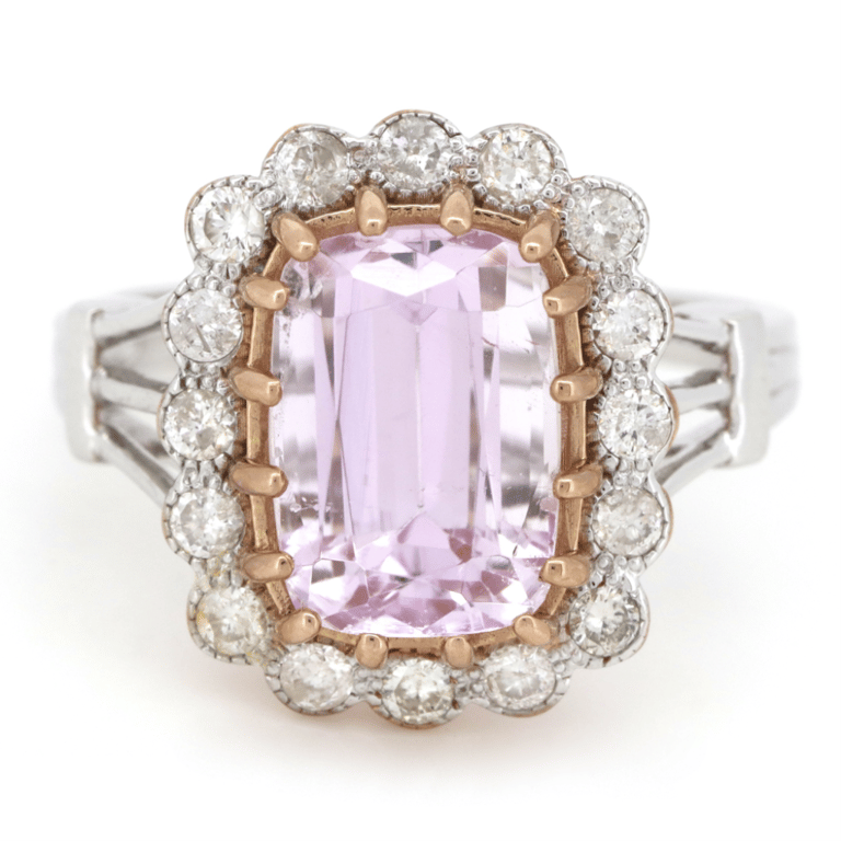 14K WHITE/ROSE GOLD, KUNZITE AND DIAMOND, VINTAGE INSPIRED RING. The Centre Features, One Cushion Cut, Medium Light Purplish-Pink, Kunzite (5.44Ct, Minor Eye Visible Inclusions), Multi-Claw Set In Rose Gold. Surrounding The Centre In Halo Are, 16 Round Brilliant Cut, Diamonds (0.51Ct Tdw, J-K Colour, Si2-I2 Clarity), Bezel Set With Millegrain Detail. Ring Size N. Valuations Provided by an Independent Third-Party Professional Not Directly Associated With Lloyds Auctions at AUD $$10,490.00This valuation has been conducted by an independent third-party professional. The valuation amount is an assessment by the issuing valuer and does not reflect the auction value of the item. Any inquiries regarding the valuation should be directed to the issuing valuer (refer to contact details on the certificate), as Lloyds Auctions has no affiliation or influence over the valuation, the valuer, or the stated amount. Condition: Good - Refer Images 0645833+1385