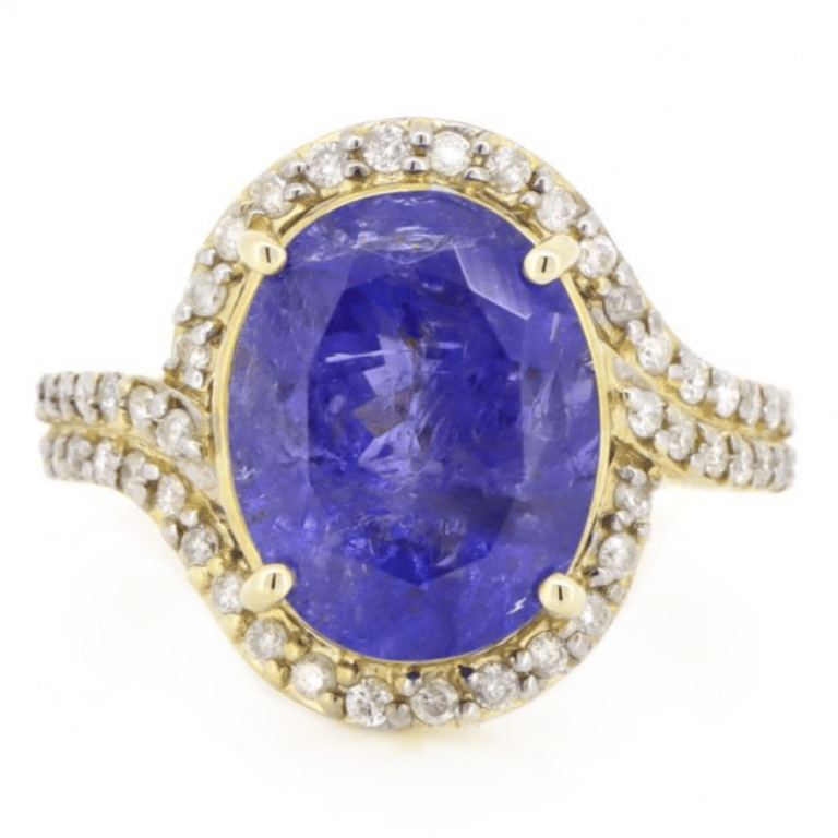 The Centre Features, One Oval Faceted Cut, Deep Violet/Blue, Tanzanite (5.89Ct, Included), Claw Set. Surrounding The Centre In A Halo And Decorating The Band Are, 50 Round Brilliant Cut, Diamonds (0.50Ct Tdw, I-K Colour, Si2-P2 Clarity), Bead Set. Ring Size N 1/2.