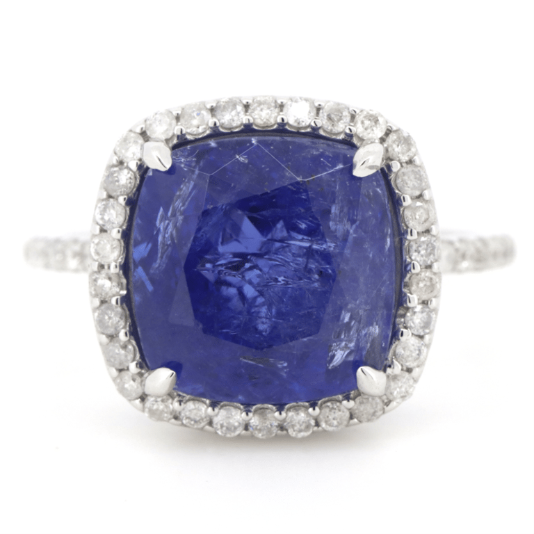 The Centre Features, One Cushion Cut, Medium Purplish-Blue, Tanzanite (6.24Ct, Included), Claw Set. Surrounding The Centre In A Halo And Decorating The Band Are, 48 Round Brilliant Cut, Diamonds (0.44Ct Tdw, J-K Colour, Si2-I2 Clarity), Micro-Claw Set. Ring Size N.