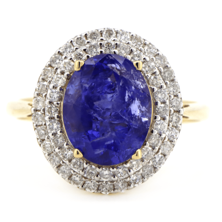 14K YELLOW GOLD, TANZANITE AND DIAMOND, DOUBLE HALO RING.