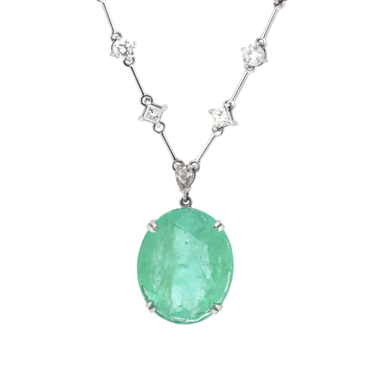 The Design Features, One Oval Mixed Cut, Vivid Moderate Green, Colombian Emerald (17.34Ct, Moderately Included), 4 Claw Set. Decorating The Chain Are, 10 Princess Cut, 10 Round Brilliant Cut And 1 Pear Brilliant Cut, Diamonds (3.81Ct Tdw, G-H Colour, Si1-Si2 Clarity), 4 Claw Set. The Necklace Features A Lobster Claw Clasp. Length Is 45Cm.