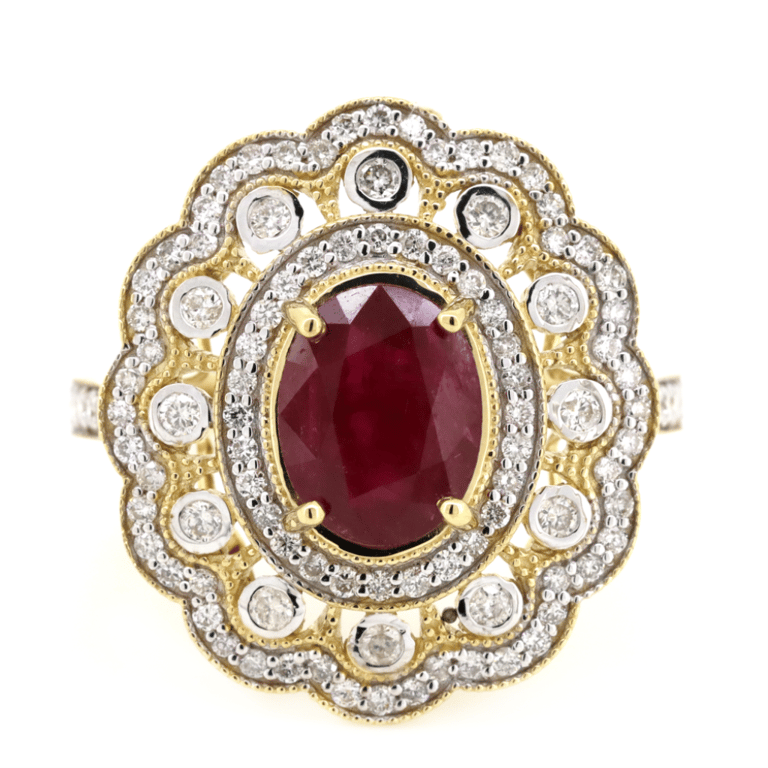 14K YELLOW GOLD, RUBY AND DIAMOND, CLUSTER RING. The Centre Features, One Oval Cut, Deep Red, Ruby (2.39Ct, Moderate Inclusions), 4 Claw Set. Surrounding The Centre And Decorating Band Are, 102 Round Brilliant Cut, Diamonds (0.74Ct Tdw, H Colour, Si Clarity), Micro-Bead Set With Millegrain Detail. Ring Size P. Valuations Provided by an Independent Third-Party Professional Not Directly Associated With Lloyds Auctions at AUD $$23,200.00This valuation has been conducted by an independent third-party professional. The valuation amount is an assessment by the issuing valuer and does not reflect the auction value of the item. Any inquiries regarding the valuation should be directed to the issuing valuer (refer to contact details on the certificate), as Lloyds Auctions has no affiliation or influence over the valuation, the valuer, or the stated amount. Condition: Good - Refer Images 0645832+5238