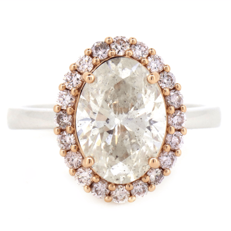 14K White/Rose Gold, Pink Diamond And Diamond, Halo Ring. The Design Features, One Oval Brilliant Cut, Diamond (3.02Ct, K-L Colour, P1-P2 Clarity), 4 Claw Halo Set. Surrounding The Centres Are, 20 Round Brilliant Cut, Blush Pink, Diamonds (0.43Ct Tdw, Si1-Si2 Clarity), Each Set Low Pip Style. Ring Size M 1/2.