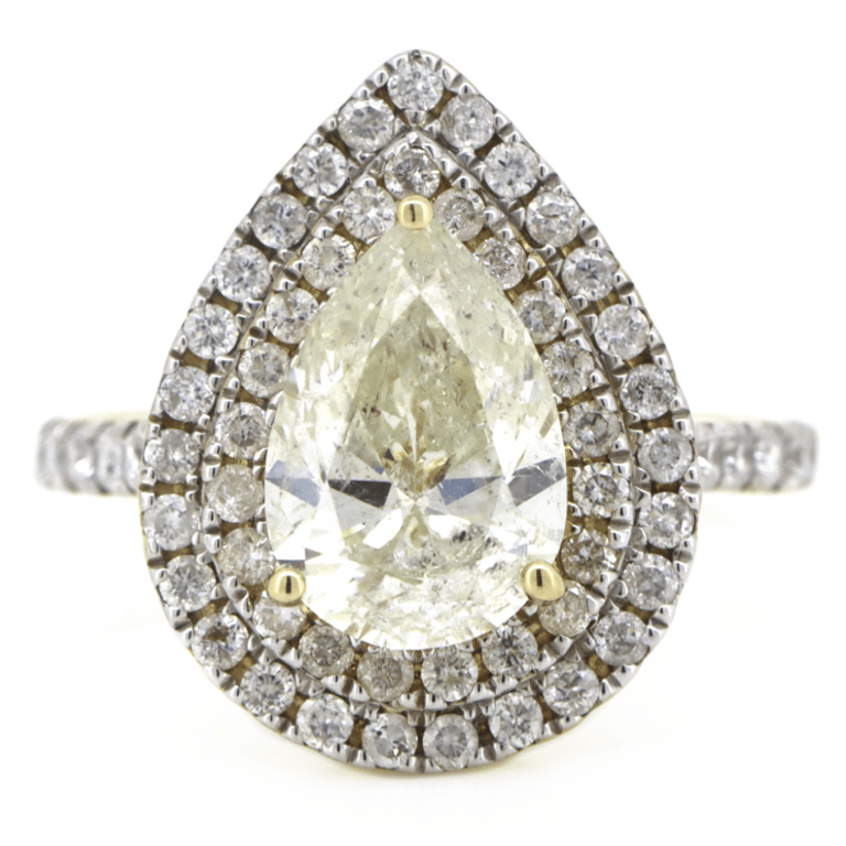 14K Yellow Gold, Fancy Yellow Diamond, Double Halo Ring. The Centre Features, One Pear Modified Brilliant Cut, Light Fancy Yellow, Diamond (2.21Ct, P1 Clarity), Claw Set. Surrounding The Centre In A Double Halo And Decorating The Band Are, 58 Round Brilliant Cut, Diamonds (0.66Ct Tdw, H-K Colour, P1+ Clarity), Bead Set. The Ring Has Been 14K White Gold Rhodium Plated, To Achieve A Two-Tone Effect. Ring Size N.