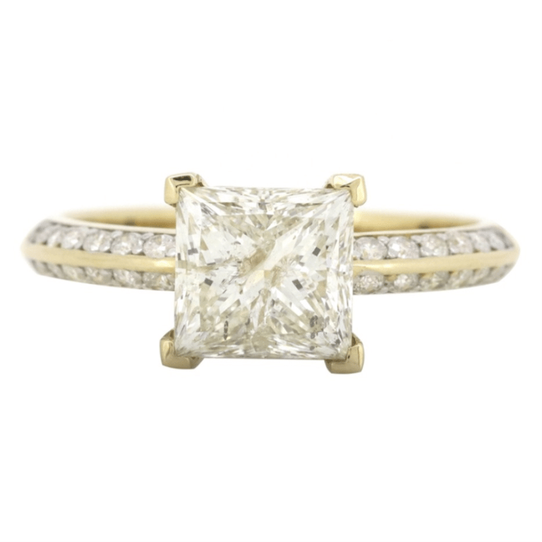 The Centre Features, One Square Princess Cut, Tinted Light Yellow, Diamond (1.20Ct, L-M Colour, P2-P3 Clarity), 4 Claw Set. Decorating The Band Are, 27 Round Brilliant Cut, Diamonds (0.24Ct Tdw, H-K Colour, P2+ Clarity), Bead Set. Ring Size M.