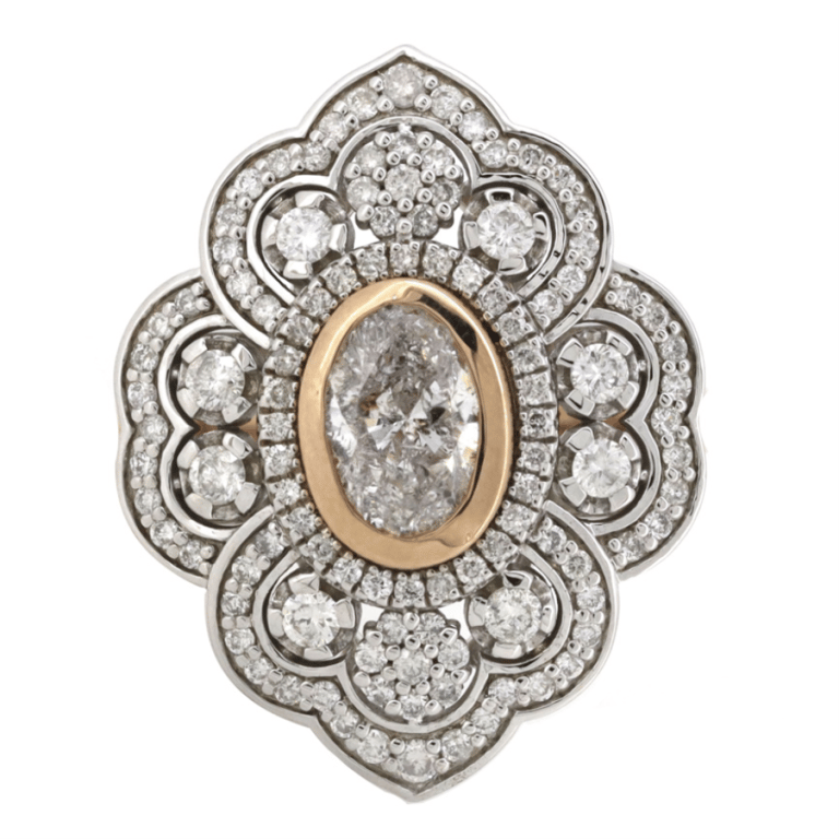 14K Rose/White Gold And Diamond, Decorative Cluster Ring. The Design Features, One Oval Modified Cut, Diamond (1.00Ct, H-I Colour, P2 Clarity), Bezel Set. Encompassing The Centre Are, 108 Round Brilliant Cut, Diamonds (0.83Ct Tdw, G-I Colour, Si2-P2 Clarity), Bead/Claw Set. Ring Size O.