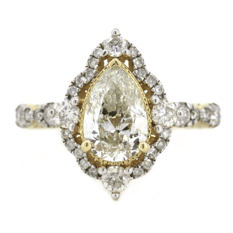 14K YELLOW GOLD AND DIAMOND, HALO RING. The Centre Features, One Pear Cut, Diamond (1.52Ct, L-M Colour, P2 Clarity), 3 Claw Halo Set. Encompassing The Centre Diamond Are, 36 Round Brilliant Cut, Diamonds (0.59Ct Tdw, G-H Colour, Si1-Si2 Clarity), Claw Set. Ring Size M 1/2. 14K Yellow Gold And Diamond, Halo Ring. The Centre Features, One Pear Cut, Diamond (1.52Ct, L-M Colour, P2 Clarity), 3 Claw Halo Set. Encompassing The Centre Diamond Are, 36 Round Brilliant Cut, Diamonds (0.59Ct Tdw, G-H Colour, Si1-Si2 Clarity), Claw Set. Ring Size M 1/2. Valuations Provided by an Independent Third-Party Professional Not Directly Associated With Lloyds Auctions at AUD $$44,000.00This valuation has been conducted by an independent third-party professional. The valuation amount is an assessment by the issuing valuer and does not reflect the auction value of the item. Any inquiries regarding the valuation should be directed to the issuing valuer (refer to contact details on the certificate), as Lloyds Auctions has no affiliation or influence over the valuation, the valuer, or the stated amount. Condition: Good - Refer Images 0645838+5360