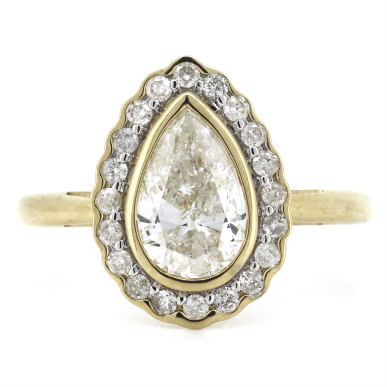 14K Yellow Gold And Diamond, Halo Ring. The Centre Features, One Pear Modified Brilliant Cut, Diamonds (1.53Ct, I-J Colour, Si1-P1 Clarity), Bezel Set. Surrounding The Centre In A Halo Are, 20 Round Brilliant Cut, Diamonds (0.30Ct Tdw, G-H Colour, Si1-Si2 Clarity), Bead Set. Ring Size O 3/4.