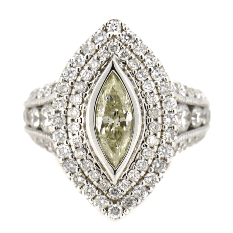 The Centre Features, One Marquise Cut, Light Fancy Yellow, Diamond (0.70Ct, P2+ Clarity), Bezel Set. Encompassing The Design Are, 86 Round Brilliant Cut, Diamonds (1.72Ct Tdw, H-K Colour, P1+ Clarity), Pip Claw/Bead Set. Ring Size L 1/2.