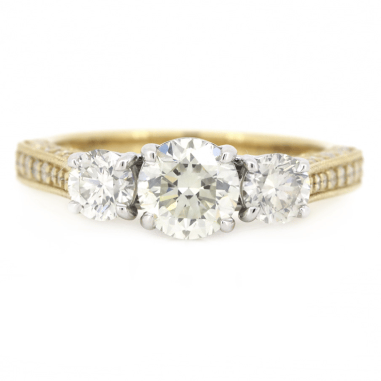 14K Yellow/White Gold And Diamond, Trilogy Ring. The Centre Features, 3 Round Brilliant Cut, Diamonds (1.52Ct Tdw, H-J Colour, Si1 Clarity), 4 Claw Set. Decorating The Band Are, 62 Round Brilliant Cut, Diamonds (0.45Ct Tdw, H-J Colour, Si-I2 Clarity), 4 Claw Set. Ring Size M.