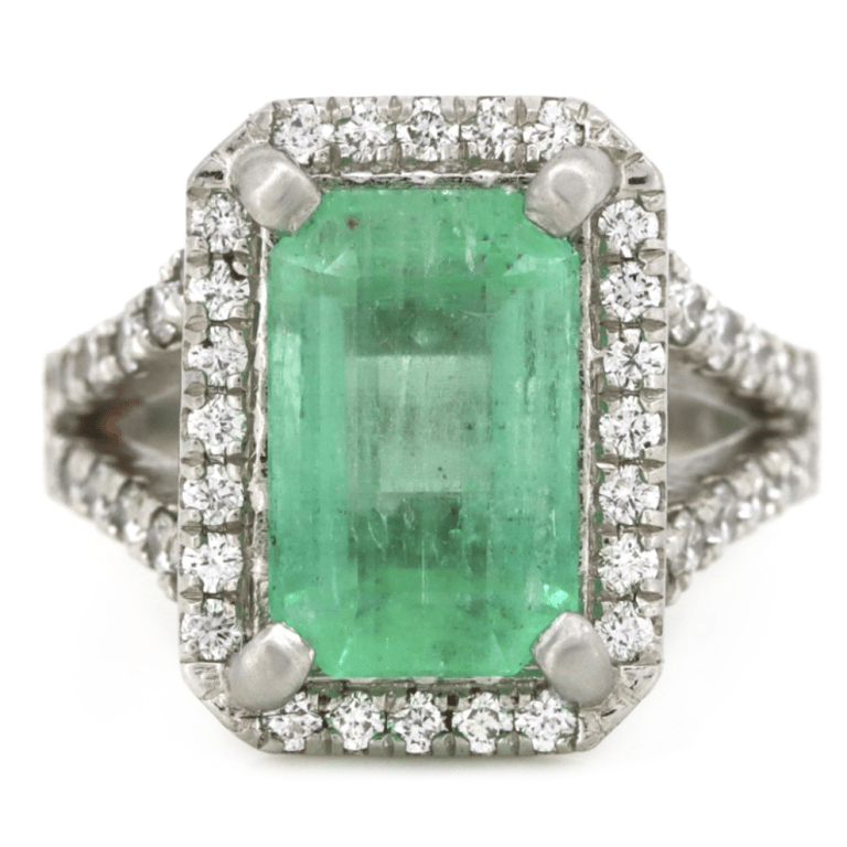 950 PLATINUM, 3.29CT COLOMBIAN EMERALD AND DIAMOND, HALO SPLIT BAND RING. The Centre Features, One Rectangle Emerald Cut, Moderate Green, Colombian Emerald (3.29Ct, Moderately Included), Claw Set. Encompassing The Design And Decorating The Band, 58 Round Brilliant Cut, Diamonds (0.66Ct Tdw, F-G Colour, Vs1-Vs2 Clarity), Micro-Bead Set. Ring Size I. 950 Platinum, 3.29Ct Colombian Emerald And Diamond, Halo Split Band Ring. The Centre Features, One Rectangle Emerald Cut, Moderate Green, Colombian Emerald (3.29Ct, Moderately Included), Claw Set. Encompassing The Design And Decorating The Band, 58 Round Brilliant Cut, Diamonds (0.66Ct Tdw, F-G Colour, Vs1-Vs2 Clarity), Micro-Bead Set. Ring Size I. Valuations Provided by an Independent Third-Party Professional Not Directly Associated With Lloyds Auctions at AUD $$53,500.00This valuation has been conducted by an independent third-party professional. The valuation amount is an assessment by the issuing valuer and does not reflect the auction value of the item. Any inquiries regarding the valuation should be directed to the issuing valuer (refer to contact details on the certificate), as Lloyds Auctions has no affiliation or influence over the valuation, the valuer, or the stated amount. Condition: Good - Refer Images 0645838+5341