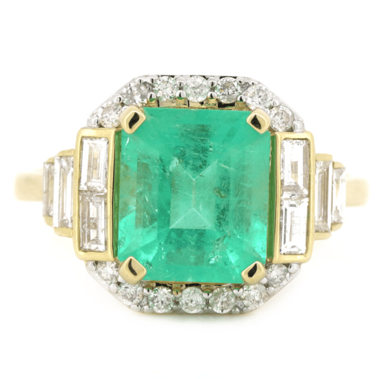 14K Yellow Gold, 2.81Ct Colombian Emerald And Diamond, Art Deco Inspired Ring. The Centre Features, One Emerald Cut, Bright Green, Colombian Emerald (2.81Ct, Light-Moderate Natural Inclusions), 4 Claw Set. Supporting The Centre Are, 8 Baguette Cut, Diamond (0.44Ct Tdw, G Colour, Vs-Si Clarity), Channel Set. Encompassing The Centre Are, 14 Round Brilliant Cut, Diamonds (0.18Ct Tdw, G-J Colour, Si-I1 Clarity), Bead Set In White Gold. Ring Size O.