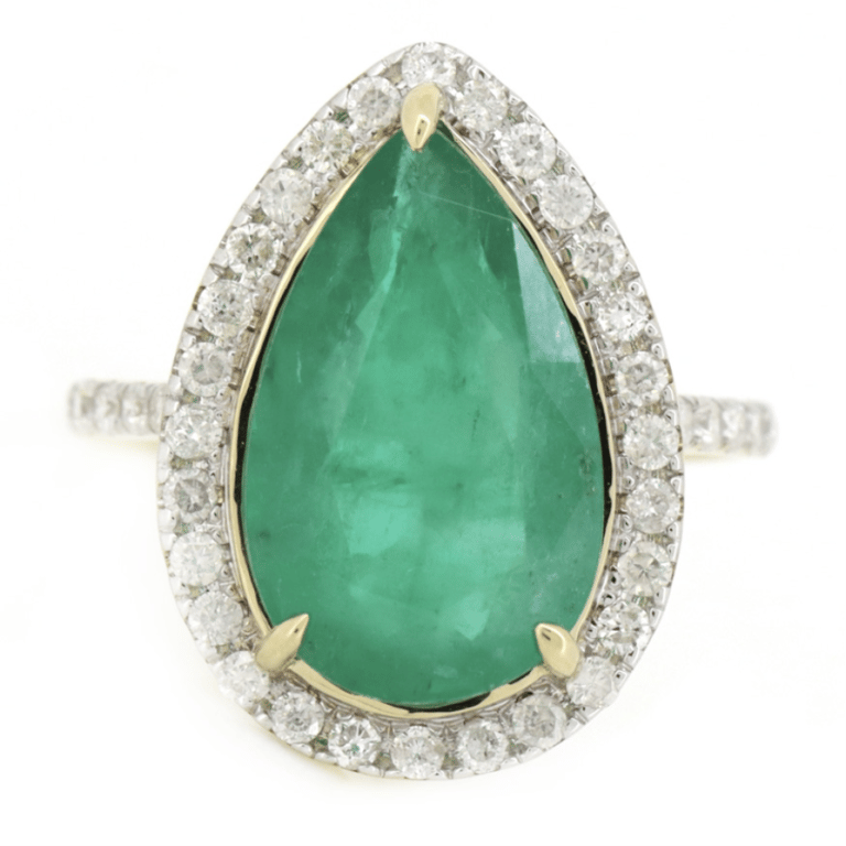 14K Yellow Gold, Emerald And Diamond, Halo Ring. The Centre Features, One Pear Faceted Cut, Strong Green, Emerald (4.68Ct, Naturally Included), 3 Claw Set. Encompassing The Design In A Halo And Decorating The Band Are, 38 Round Brilliant Cut, Diamonds (0.48Ct Tdw, H-J Colour, Si-P2 Clarity), Micro-Bead Set In White Gold. Ring Size N.