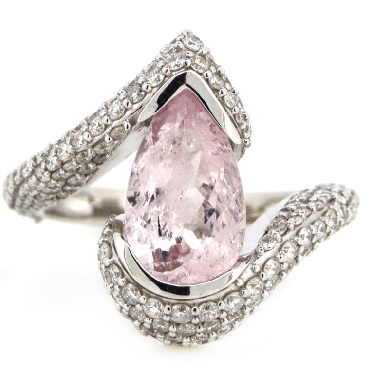 14K White Gold, Morganite And Diamond, Crossover Ring. The Centre Features, One Pear Mixed Cut, Light Pink, Morganite (3.40Ct, Slightly Included), Bezel Set. Encompassing The Centre In A Cluster Are, 208 Round Brilliant Cut, Diamonds (2.19Ct Tdw, G-H Colour, Si1-Si2 Clarity), Bead Set. Ring Size Q.