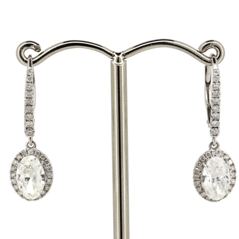 14K WHITE GOLD AND DIAMOND, HALO DROP EARRINGS. The Design Features, 2 Round Brilliant Cut, Diamonds (2.010Ct Tdw, F Colour, Si-I2 Clarity), Claw Set. Surrounding The Centres In A Halo And Decorating The Hooks Are, 58 Round Brilliant Cut, Diamonds (0.40Ct Tdw, H-J Colour, Si2-P2 Clarity), Micro-Claw Set. Earrings Have Lever Back Closures. 14K White Gold And Diamond, Halo Drop Earrings. The Design Features, 2 Round Brilliant Cut, Diamonds (2.010Ct Tdw, F Colour, Si-I2 Clarity), Claw Set. Surrounding The Centres In A Halo And Decorating The Hooks Are, 58 Round Brilliant Cut, Diamonds (0.40Ct Tdw, H-J Colour, Si2-P2 Clarity), Micro-Claw Set. Earrings Have Lever Back Closures. Valuations Provided by an Independent Third-Party Professional Not Directly Associated With Lloyds Auctions at AUD $$35,500.00This valuation has been conducted by an independent third-party professional. The valuation amount is an assessment by the issuing valuer and does not reflect the auction value of the item. Any inquiries regarding the valuation should be directed to the issuing valuer (refer to contact details on the certificate), as Lloyds Auctions has no affiliation or influence over the valuation, the valuer, or the stated amount. Condition: Good - Refer Images 0645838+5315