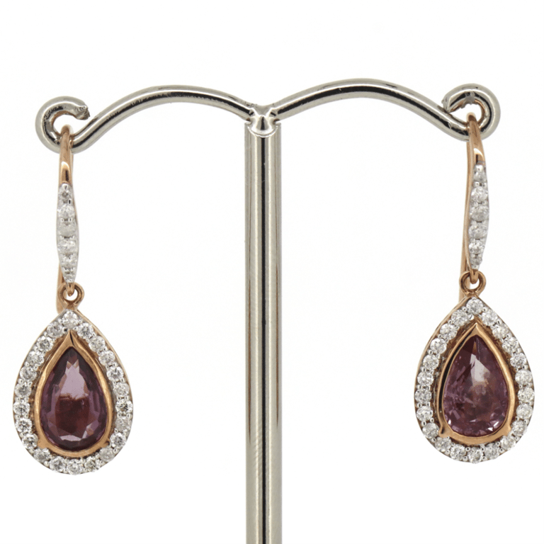 14K Yellow Gold, Pink Sapphire And Diamond, Halo Drop Earrings. The Drops Feature, 2 Pear Cut, Deep Moderate Orange-Pink, Sapphires (2.66Ct Tsw, Moderate Inclusions), Bezel Set. Surrounding The Centres In Halos And Decorating The Hooks Are, 56 Round Brilliant Cut, Diamonds (0.60Ct Tdw, G-H Colour, Si1-Si2 Clarity), Micro-Claw Set In White Gold. The Earrings Feature Sheppard Hooks.