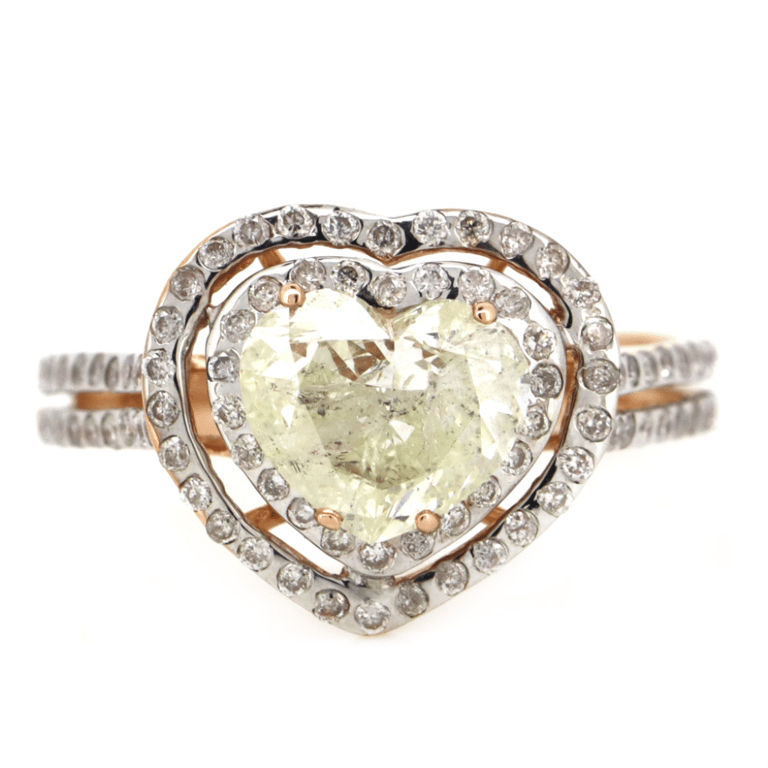 14K Rose Gold, Yellow Diamond, Double Halo Ring. The Centre Features, One Heart Modified Brilliant Cut, Light Fancy Yellow, Diamond (0.91Ct, P1-P2 Clarity), 4 Claw Set. Surrounding The Centre In A Double Halo And Decorating The Band Are, 88 Round Brilliant Cut, Diamonds (0.33Ct Tdw, I-K Colour, Si2-P2 Clarity), Claw Set. Ring Size J 1/2.