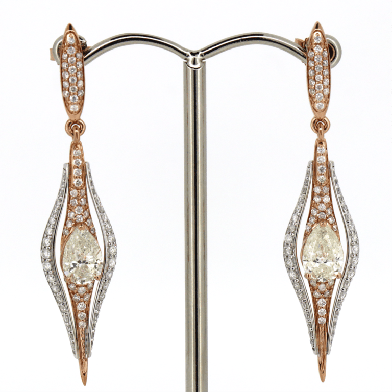 14K ROSE/WHITE GOLD AND DIAMOND, DROP EARRINGS. The Centres Feature, 2 Pear Cut, Diamonds (1.99Ct Tdw, I-J Colour, P2 Clarity), 4 Claw Basket Set. Decorating The Centre Are, 152 Round Brilliant Cut, Diamonds (1.00Ct Tdw, G-H Colour, Si1-Si2 Clarity), Bead Set. 14K Rose/White Gold And Diamond, Drop Earrings. The Centres Feature, 2 Pear Cut, Diamonds (1.99Ct Tdw, I-J Colour, P2 Clarity), 4 Claw Basket Set. Decorating The Centre Are, 152 Round Brilliant Cut, Diamonds (1.00Ct Tdw, G-H Colour, Si1-Si2 Clarity), Bead Set. Valuations Provided by an Independent Third-Party Professional Not Directly Associated With Lloyds Auctions at AUD $$33,000.00This valuation has been conducted by an independent third-party professional. The valuation amount is an assessment by the issuing valuer and does not reflect the auction value of the item. Any inquiries regarding the valuation should be directed to the issuing valuer (refer to contact details on the certificate), as Lloyds Auctions has no affiliation or influence over the valuation, the valuer, or the stated amount. Condition: Good - Refer Images 0645838+5347