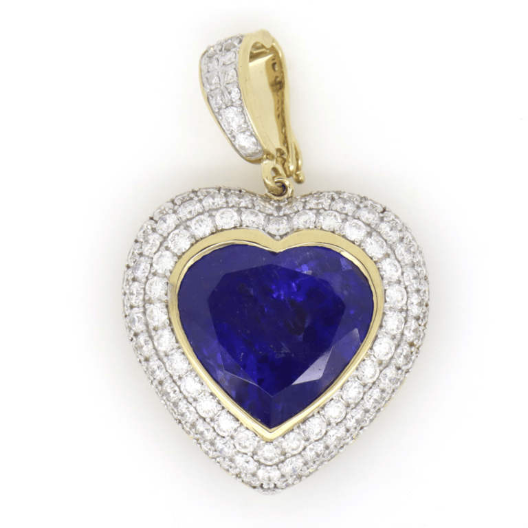 14K White Gold, 15.52Ct Tanzanite And Diamond, Statement Pendant. The Centre Features, One Heart Cut, Vivid Blue, Tanzanite (15.52Ct, Moderate Natural Inclusions), Bezel Set. Decorating The Setting And Embellishing The Bail Are, 106 Round Brilliant Cut, Diamonds (2.96Ct Tdw, H-I Colour, Si-I1 Clarity), Bead Set.
