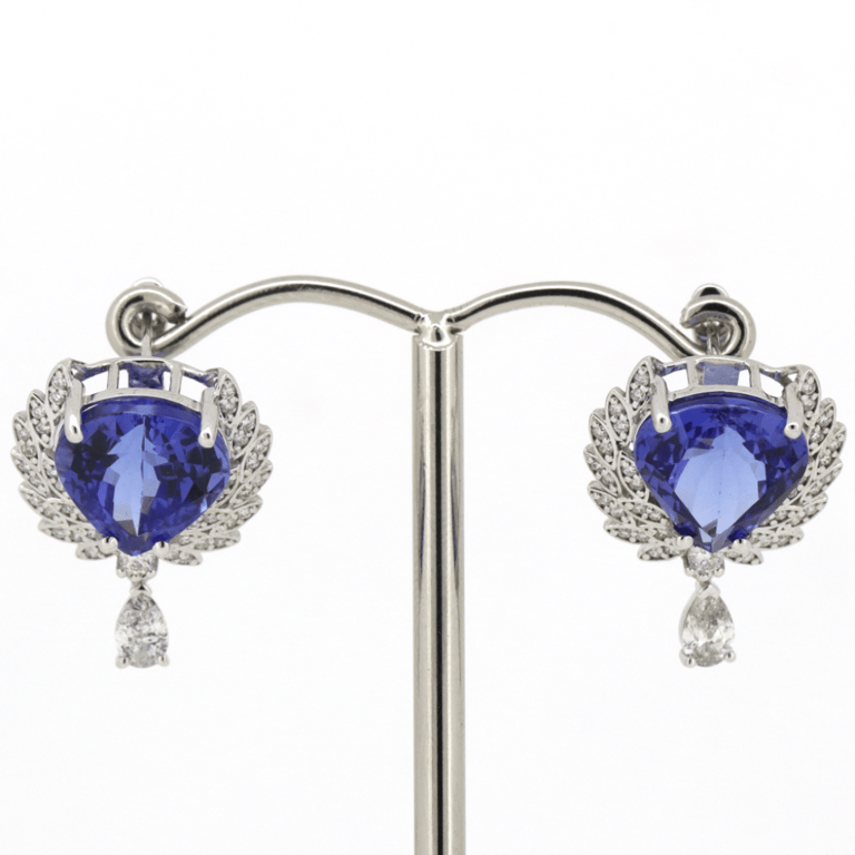 14K White Gold, Tanzanite And Diamond, Earrings. The Centres Feature, 2 Pear Mixed Cuts, Deep Purple-Violet, Tanzanites (8.64Ct Tsw, Eye Clean Clarity), 4 Claw-Basket Set. Encompassing The Centres Are, 82 Round Brilliant Cut, Diamonds (0.34Ct Tdw, G-H Colour, Si1-Si2 Clarity), Bead Set. Decorating The Drops Are, 2 Pear Brilliant Cuts, Diamonds (0.36Ct Tdw, G-H Colour, Si1-Si2 Clarity), Claw Set. The Earrings Feature Half Hinged Clips.