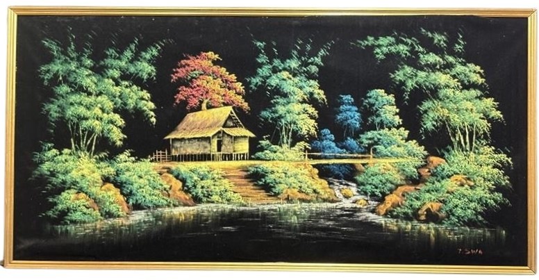 T.SWAAcrylic On Black Velvet, FramedTitle: Balinese Riverside Landscape With HutSignature Details: Signed Lower Right T.SwaCondition: Fair - Refer To ImagesSr562196+6
