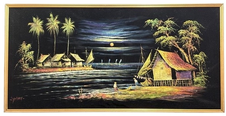 YOHANIAcrylic On Black Velvet (Framed)Title: Balinese Night Seascape With Village Huts And BoatsSignature Details: Signed Lower Left “Yohani”Condition: Fair - Refer To ImagesSr562196+8