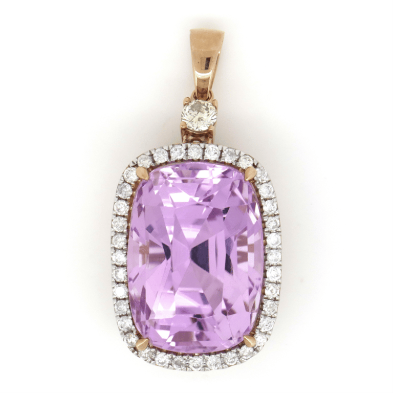 14K ROSE GOLD, 32.39CT KUNZITE AND DIAMOND, STATEMENT PENDANT. The Centre Features, One Rectangular Cushion Cut, Medium Deep Purplish-Pink, Kunzite, (32.39Ct, Very Slightly Included), Claw Set. Decorating The Bail Is, One Round Brilliant Cut, Fancy Yellow, Diamond (0.25Ct, P1 Clarity), 4 Claw Set. Surrounding The Centre In A Halo Are, 36 Round Brilliant Cut, Diamonds (0.54Ct Tdw, I-K Colour, Si2-P2 Clarity), Claw Set. Valuations Provided by an Independent Third-Party Professional Not Directly Associated With Lloyds Auctions at AUD $$28,680.00This valuation has been conducted by an independent third-party professional. The valuation amount is an assessment by the issuing valuer and does not reflect the auction value of the item. Any inquiries regarding the valuation should be directed to the issuing valuer (refer to contact details on the certificate), as Lloyds Auctions has no affiliation or influence over the valuation, the valuer, or the stated amount. Condition: Good - Refer Images 0645831+1050