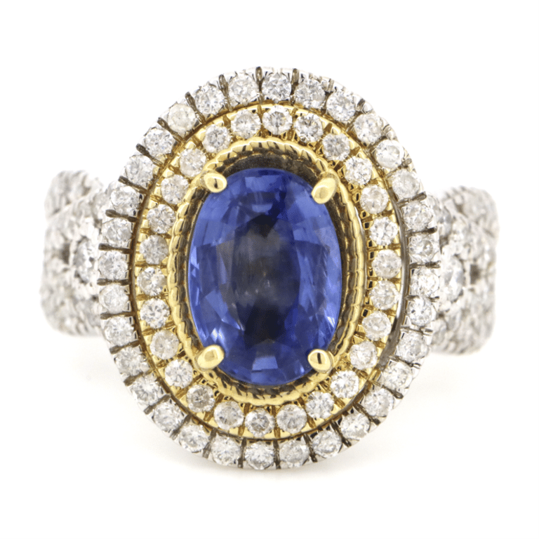 14K WHITE/YELLOW GOLD, SAPPHIRE AND DIAMOND, DOUBLE HALO RING. The Centre Features, One Oval Mixed Faceted Cut, Moderate Deep Blue, Ceylon Sapphire (2.21Ct, Heavily Included), 4-Claw Set In Yellow Gold. Surrounding The Centre In A Double Halo And Decorating The Band Are, 108 Round Brilliant Cut, Diamonds (1.05Ct Tdw, H-K Colour, P2+ Clarity), Bead Set. Ring Size M 1/2. Valuations Provided by an Independent Third-Party Professional Not Directly Associated With Lloyds Auctions at AUD $$15,200.00This valuation has been conducted by an independent third-party professional. The valuation amount is an assessment by the issuing valuer and does not reflect the auction value of the item. Any inquiries regarding the valuation should be directed to the issuing valuer (refer to contact details on the certificate), as Lloyds Auctions has no affiliation or influence over the valuation, the valuer, or the stated amount. Condition: Good - Refer Images 0645831+1071