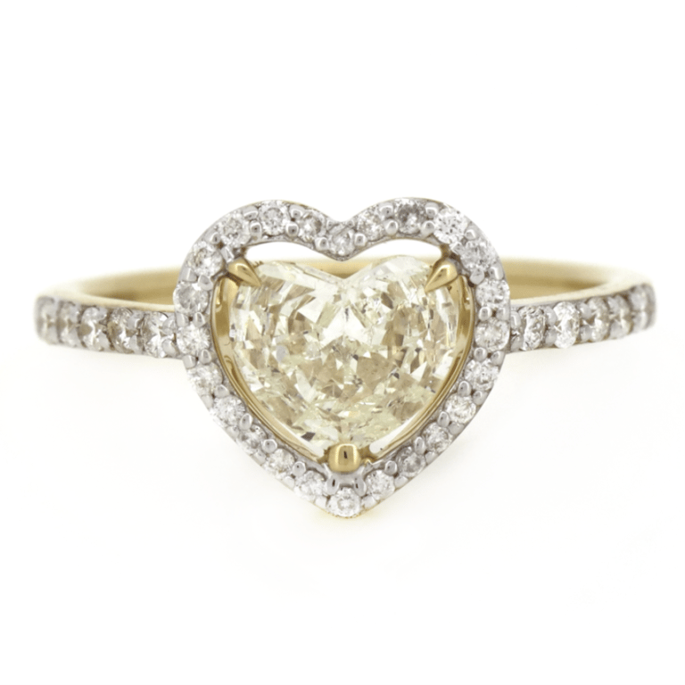 14K YELLOW GOLD AND DIAMOND, HALO RING. The Centre Features, One Heart Shaped Cut, Diamond (0.77Ct, M-N Colour, Si2-P1 Clarity), 4 Claw Set. Surrounding The Centre In A Halo And Decorating The Band Are, 34 Round Brilliant Cut, Diamonds (0.25Ct Tdw, H-J Colour, Si1-P1 Clarity), Claw Set. Ring Size M. Valuations Provided by an Independent Third-Party Professional Not Directly Associated With Lloyds Auctions at AUD $$14,000.00This valuation has been conducted by an independent third-party professional. The valuation amount is an assessment by the issuing valuer and does not reflect the auction value of the item. Any inquiries regarding the valuation should be directed to the issuing valuer (refer to contact details on the certificate), as Lloyds Auctions has no affiliation or influence over the valuation, the valuer, or the stated amount. Condition: Good - Refer Images 0645831+1095