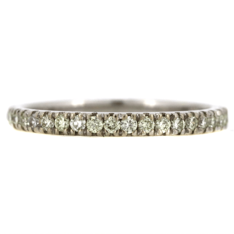14K WHITE GOLD AND DIAMOND, BAND RING. The Ring Features, 18 Round Brilliant Cut, Diamonds, Claw Set. Ring Size H 1/2. Total Weight Is 1.33 Grams. Condition: Pre-Owned. Condition: Good - Refer Images 0645831+1085