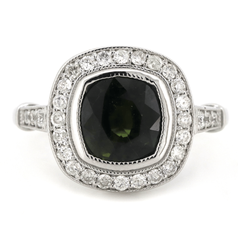 The Centre Features, One Cushion Faceted Cut, Deep Green, Sapphire (2.08Ct, Slightly Included), Bezel Set. Surrounding The Centre In A Halo And Decorating The Shoulders Are, 30 Round Brilliant Cut, Diamonds (0.39Ct Tdw, I-K Colour, P1-P2 Clarity), Bead Set. Ring Size N 1/2.