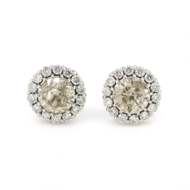 14K WHITE GOLD, FANCY BROWN DIAMOND, HALO STUD EARRINGS. The Centres Feature, 2 Round Brilliant Cut, Fancy Light Brown, Diamonds (2.06Ct Tdw, P2 Clarity), Multi-Claw Set. Surrounding The Centres In Halos Are, 32 Round Brilliant Cut, Diamonds (0.68Ct Tdw, G-H Colour, Si-P1 Clarity), Shared Claw Set. The Earrings Have Post Backs, With 14K White Gold Butterfly Clasps. Valuations Provided by an Independent Third-Party Professional Not Directly Associated With Lloyds Auctions at AUD $$18,000.00This valuation has been conducted by an independent third-party professional. The valuation amount is an assessment by the issuing valuer and does not reflect the auction value of the item. Any inquiries regarding the valuation should be directed to the issuing valuer (refer to contact details on the certificate), as Lloyds Auctions has no affiliation or influence over the valuation, the valuer, or the stated amount. Condition: Good - Refer Images 0645831+1006