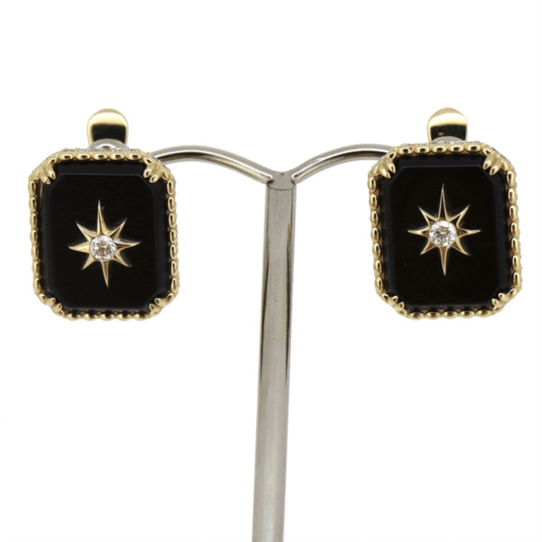 The Earrings Feature, 2 Flat Cabochon Cut, Black, Onyx (7.44Ct Tsw, Opaque), Double 4 Claw Set. Centering The Onyx Are, 2 Round Brilliant Cut, Diamonds (0.51Ct Tdw, H-I Colour, Si-P1 Clarity), Bead Set. The Earrings Have Huggie Closures.