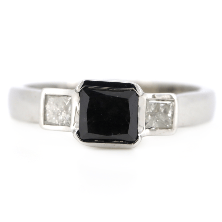14K WHITE GOLD, BLACK DIAMOND AND DIAMOND, TRILOGY RING. The Centre Features, One Princess Cut, Black, Diamond (0.89Ct, Clarity-Opaque), Bezel Set. Decorating The Accents Are, 2 Princess Cut, Diamonds (0.29Ct Tdw, H-I Colour, Si-11 Clarity), Bezel Set.Ring Size M 1/2. Valuations Provided by an Independent Third-Party Professional Not Directly Associated With Lloyds Auctions at AUD $$8,500.00This valuation has been conducted by an independent third-party professional. The valuation amount is an assessment by the issuing valuer and does not reflect the auction value of the item. Any inquiries regarding the valuation should be directed to the issuing valuer (refer to contact details on the certificate), as Lloyds Auctions has no affiliation or influence over the valuation, the valuer, or the stated amount. Condition: Good - Refer Images 0645831+1100