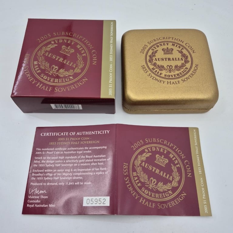 Australian Mint Scarce Scarce 2005 Subscription 2 Ounce Silver And Inseted 24 Carat Gold Plated Sovereign Coin.