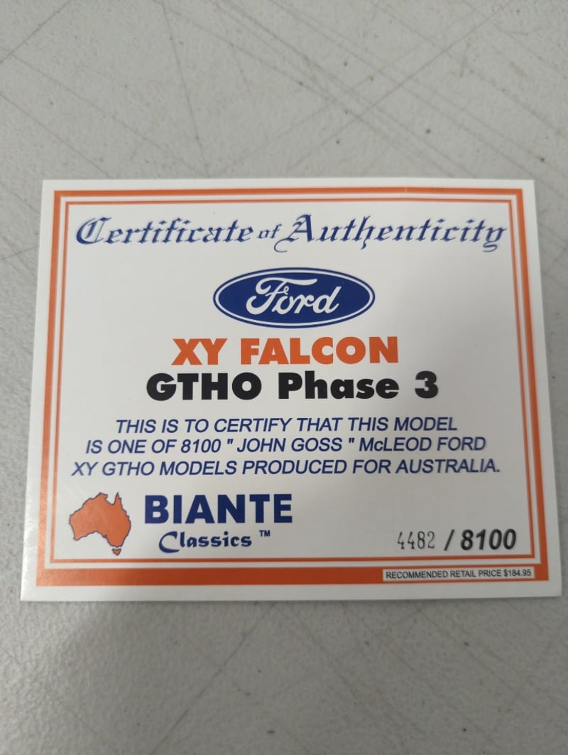 MODEL CAR, FORD XY FALCON GTHO PHASE 3, BIANTE CLASSICS, 1/18 SCALE