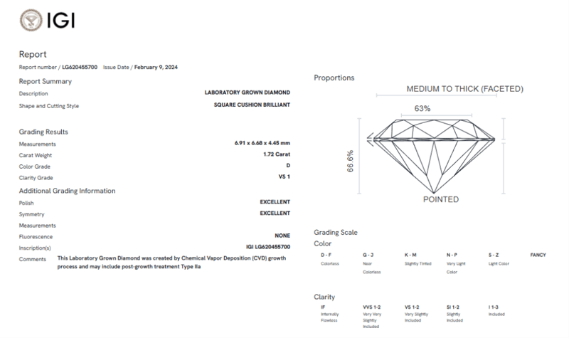 Please note that while all lab grown diamonds listed include certification, the report number or identification may vary upon arrival. This is due to standard manufacturing and batching processes. However, the diamond’s specifications — including carat, color, cut, and clarity — will match or may even exceed those advertised.
