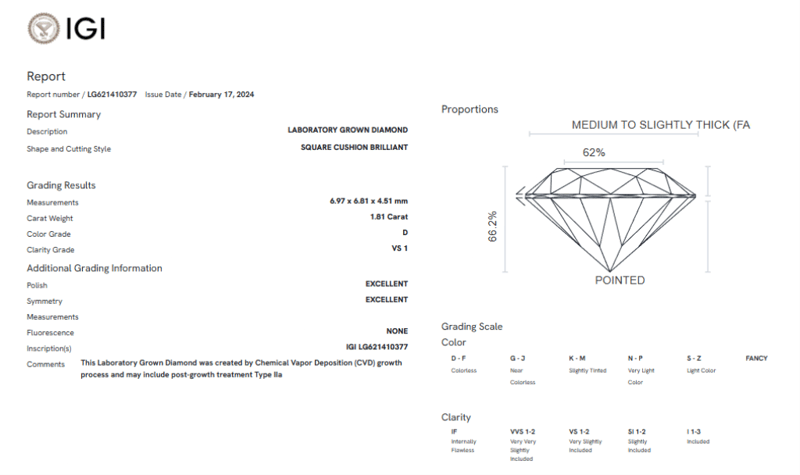 1.81 CARATS D/VS1 LAB GROWN DIAMOND - IGI CERTIFIED 1.81 Carats D/Vs1 Lab Grown Diamond - Igi CertifiedCertificate Number - 621410377Color/Clarity - D/Vs1Shape - Square CushionDimension - 6.97 X 6.81 X 4.51 MmCut - N/ASymmetry - ExcellentFluorescence - NonePolish - ExcellentExternal Video Link - Https://Ds-360.Jaykar.Co.In/Ds360/9B241145/Video/9B241145.Html Condition: Good - Refer Images 0160773+2