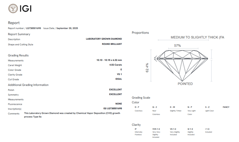 4.02 CARATS E/VS1 LAB GROWN DIAMOND - IGI CERTIFIED