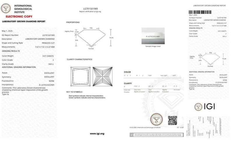 3.01 CARAT PRINCESS CUT DIAMOND F/VVS2 Igi Certificate # Lg 701501989 Laser Inscribed : Labgrown Lg 701501989 Polish : Excellent Symmetry : Excellent Flourescence : None Type : Cvd Condition: Good - Refer Images 0488963+10405