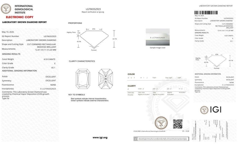 4.53 CARAT RADIANT CUT DIAMOND E/VS1 Igi Certificate # 706552923 Laser Inscribed : Labgrown Igi 706552923 Polish : Excellent Symmetry : Excellent Flourescence : None Type : Cvd Condition: Good - Refer Images 0488963+10414