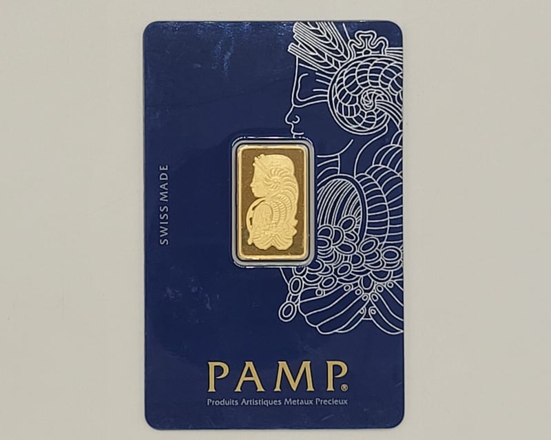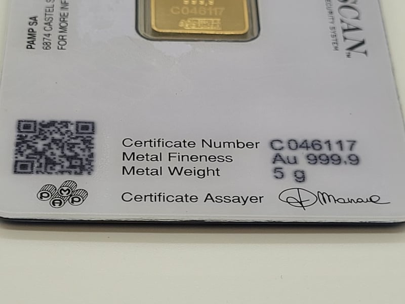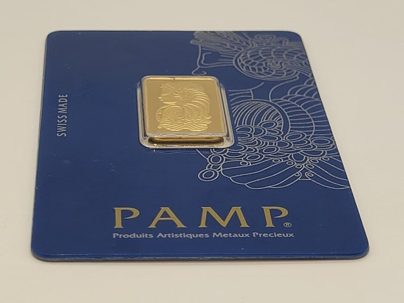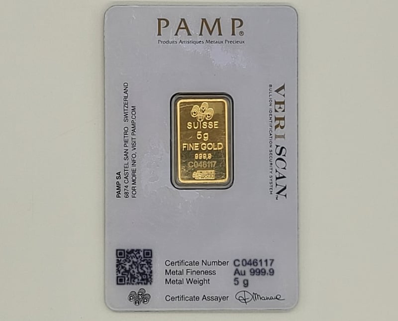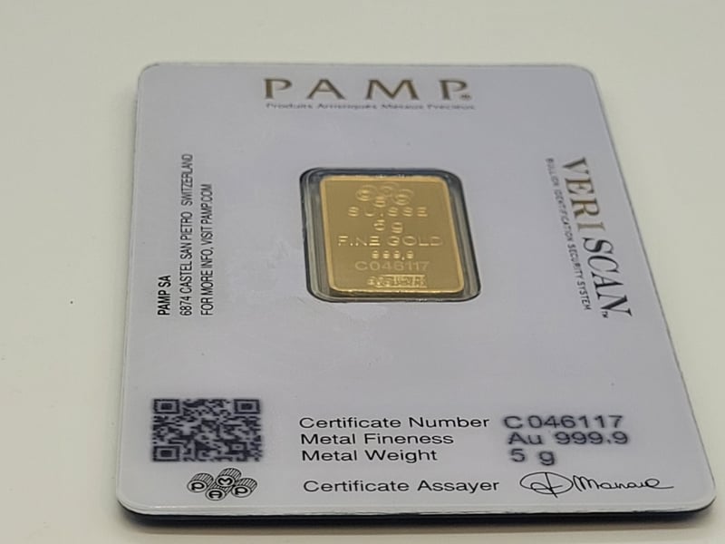 SWISS MADE GOLD MINTED BAR. FROM PAMP. NO: C046117. Fineness: 999.9% Weight: 5G Condition: Good - Refer To Images WINNELLIE 153851+9