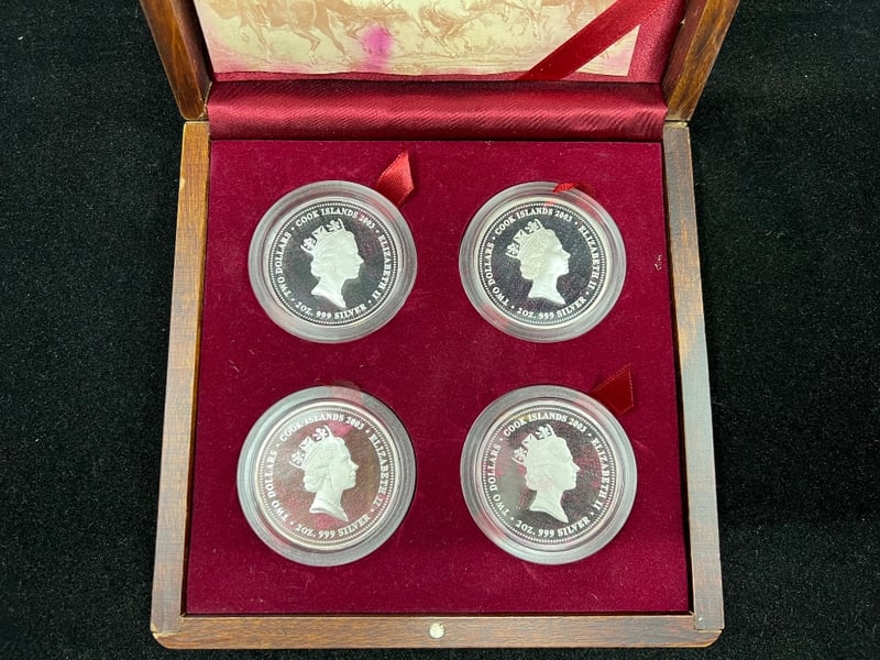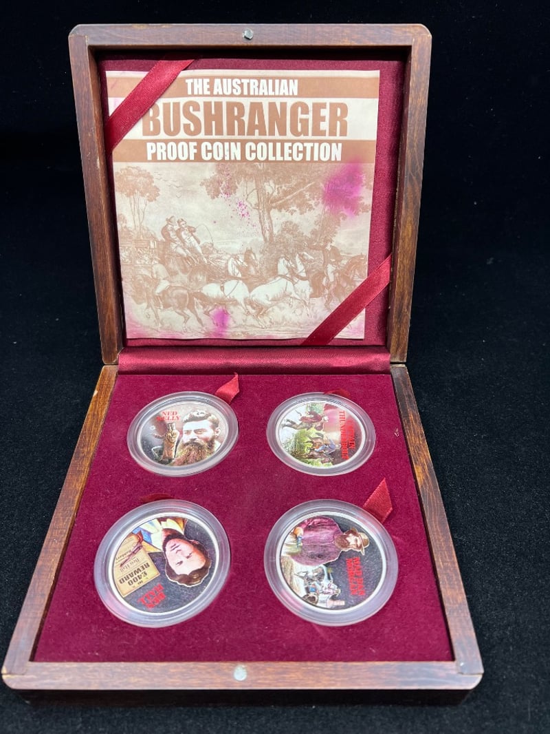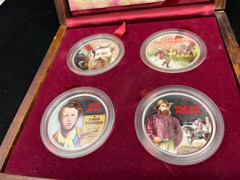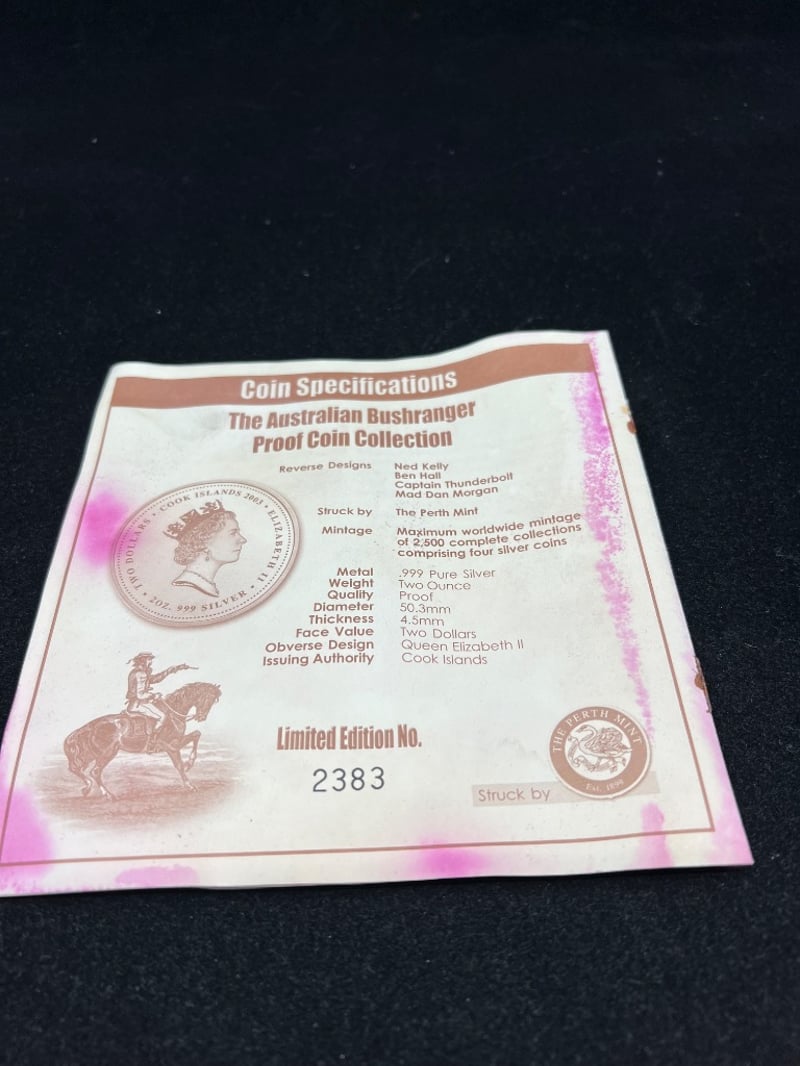AUSTRALIAN THE PERTH MINT 2003 FOUR SPECIAL BUSHRANGER COLLECTION 2OZ EACH, SILVER COLOURED COINS.