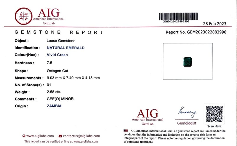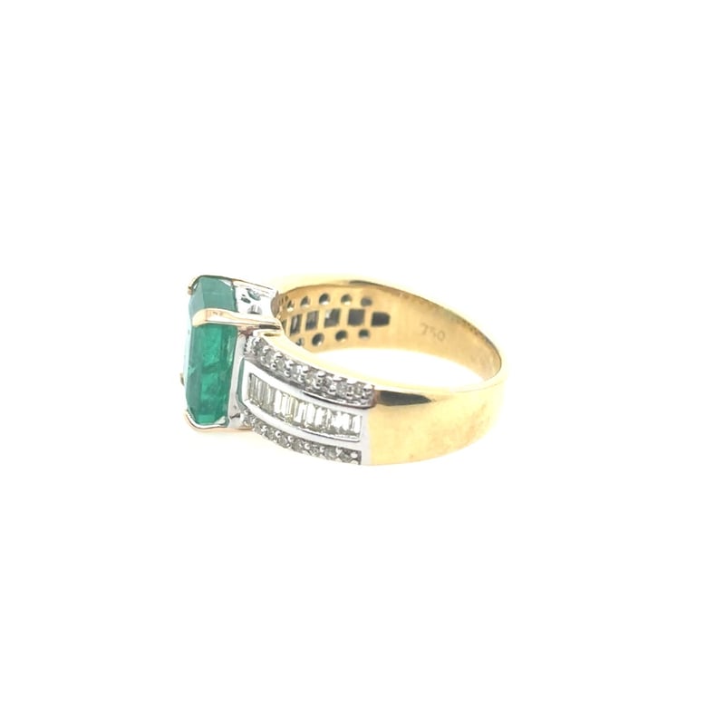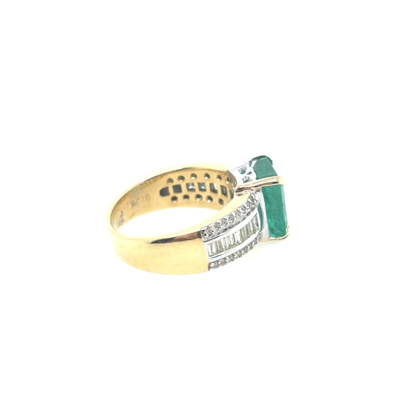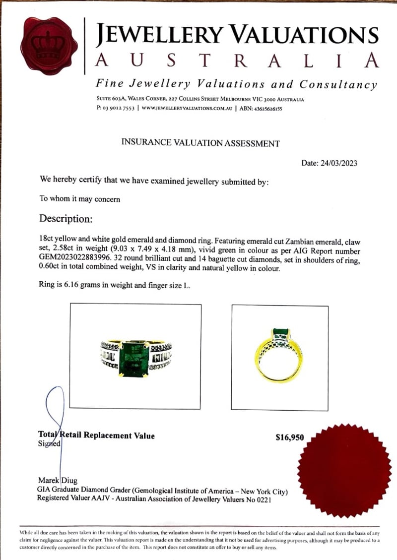Featuring Emerald Cut Zambian Emerald, Claw Set, 2.58Ct In Weight (9.03 X 7.49 X 4.18 Mm), Vivid Green In Colour As Per Aig Report Number Gem2023022883996. 32 Round Brilliant Cut And 14 Baguette Cut Diamonds, Set In Shoulders Of Ring, 0.60Ct In Total Combined Weight, Vs In Clarity And Natural Yellow In Colour. Ring Is 6.16 Grams In Weight And Finger Size L