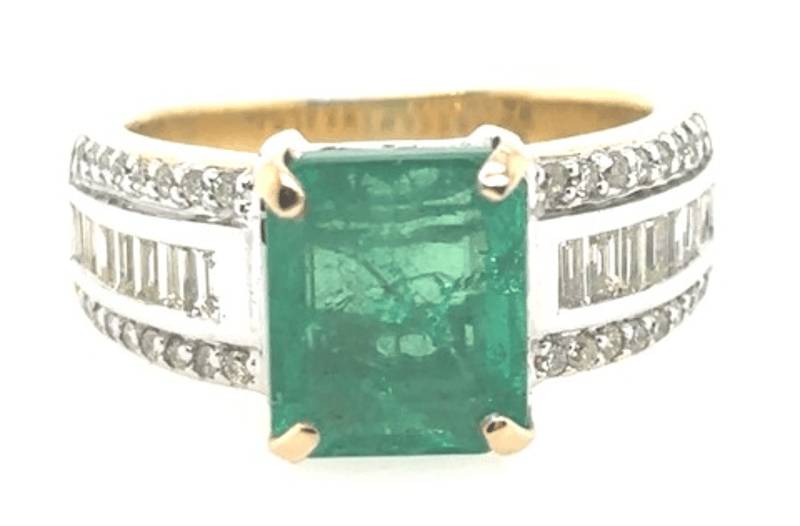 18CT YELLOW AND WHITE GOLD EMERALD AND DIAMOND RING