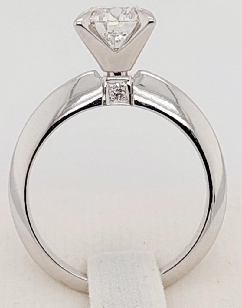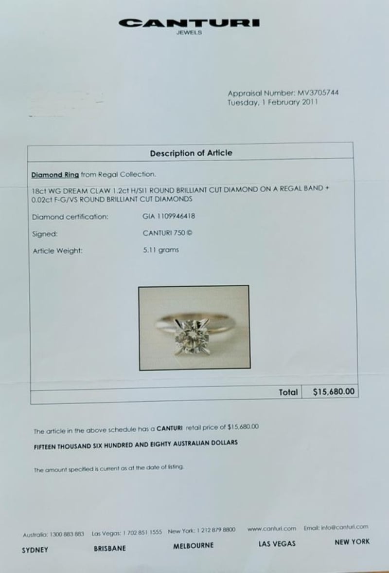 18CT WHITE GOLD DIAMOND SOLITAIRE RING Total Item Weight: 5.11gms This 18 Carat White Gold Ring With A Regal Band Features One 1.2Ct Dream Claw Set Round Brilliant Cut Diamond, Si In Clarity And H In Colour As Per Gia Report Number 1109946418. Two Round Brilliant Cut Diamonds Are Set On Each Side Of The Shank, 0.02Ct In Combined Weight, Vs In Clarity And F-G In Colour. Jewellery Valuations Provided By A Third Party Professional Not Directly Associated With Lloyds Auctions at AUD $15680This Insurance Valuation has been provided by a registered Jewellery Valuer and is intended for insurance purposes only. The valuation amount has no bearing on the auction value of the item. Any questions regarding the valuation should be directed to the issuing Valuer (refer to contact details on the certificate) as Lloyds have no association or relationship with the Valuer or the valuation amount contained within the valuation. Condition: Excellent- Refer Images 0162901+30CROSSDOCK